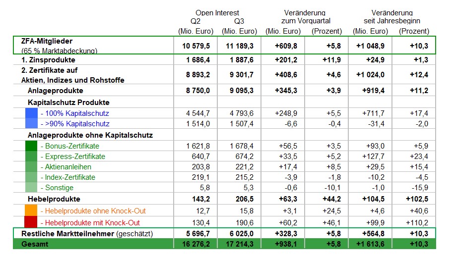 Seit Jänner 2018 werden Express-Zertifikate gesondert ausgewiesen, dadurch ist der Wert für Bonus-Zertifikate nicht mit früheren Marktberichten vergleichbar. Alle Angaben beziehen sich auf die neue Datenbasis. Das Zertifikate Forum Austria hat die Veröffentlichung der Marktstatistik von monatsweise auf Quartalsberichterstattung umgestellt. Der Bericht über das 3. Quartal 2025 ist der erste nach neuer Berechnungsmethode. Bei der Darstellung des Open Interest ergeben sich dadurch keine Änderungen, die Entwicklung der Umsätze im Quartalsvergleich wird erst ab dem nächsten Quartalsbericht über das 4. Quartal im Jänner 2026 wieder aufgenommen. Im vorliegenden Bericht sind lediglich die Umsätze des 3. Quartals angegeben.