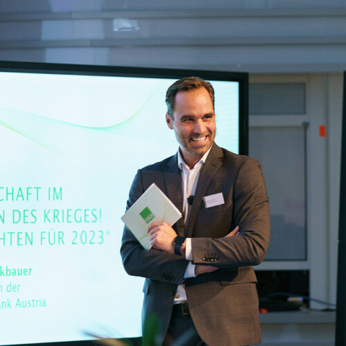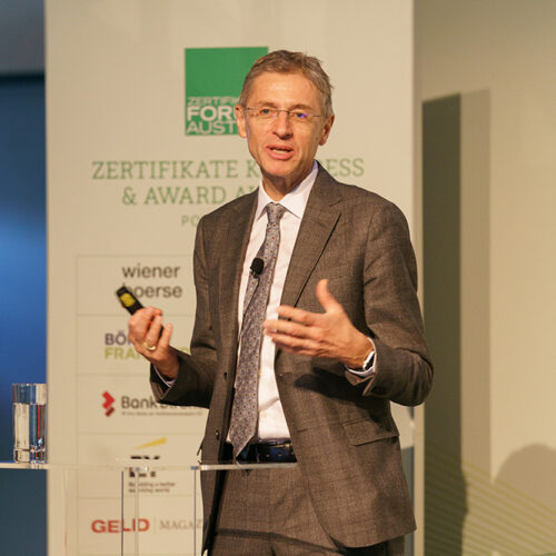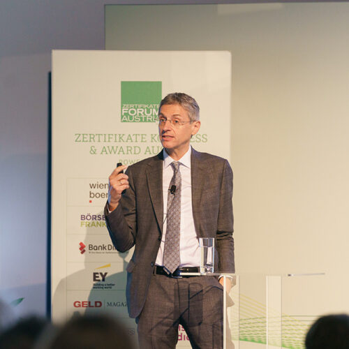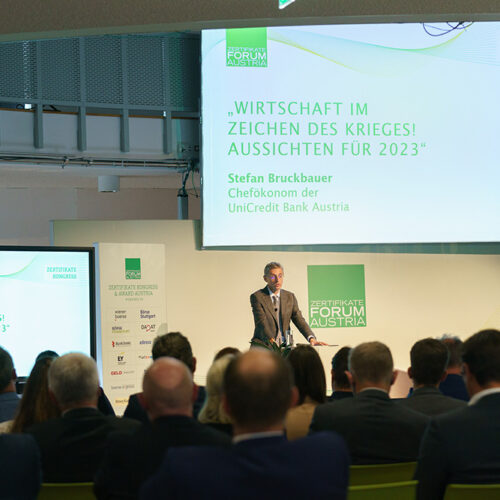 Nach der Begrüßung durch den Vorstandsvorsitzenden des Zertifikate Forum Austria, Frank Weingarts, war in diesem Jahr Stefan Bruckbauer, Chefökonom der UniCredit Bank Austria AG mit dem Vortrag „WIRT SCHAF T IM ZEICHEN DES
