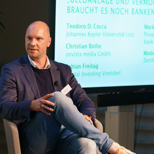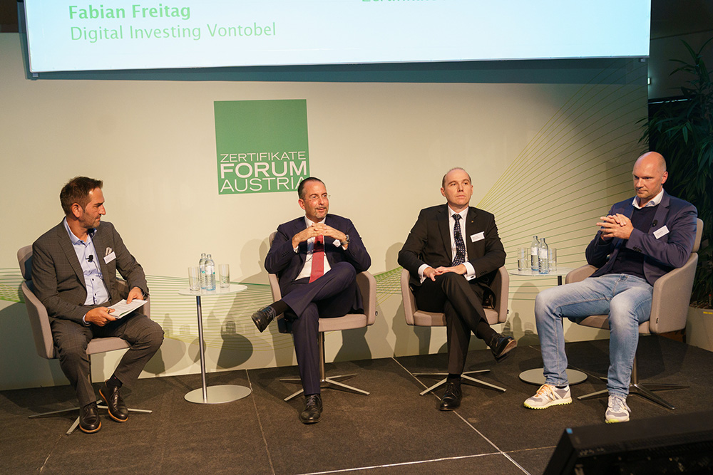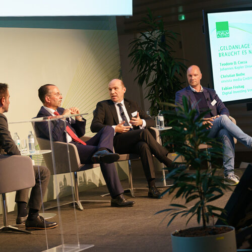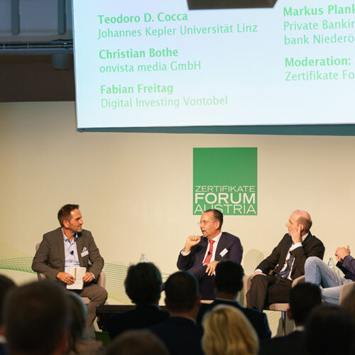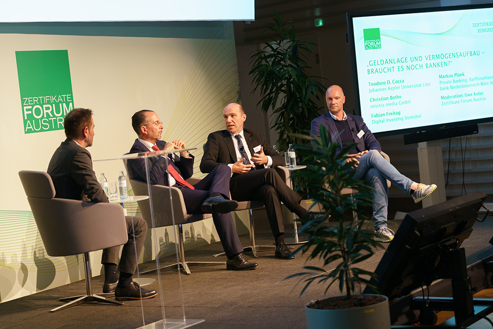 Nach der Pause diskutierten Teodoro D. Cocca – Stv. Institutsvorstand, Johannes Kepler Universität Linz, Christian Bothe – Geschäftsführer, onvista media GmbH und Markus Plank, Bereichsleiter Wertpapierkompetenzzentrum & Private Banking, Raiff eisenlandesbank Niederösterreich-Wien AG unter der Moderation von Uwe Kolar, Mitglied des Vorstandes, Zertifikate Forum Austria ein brisantes Thema „GELDANL AGE UND VERMÖGENSAUFBAU – BRAUCHT ES NOCH BANKEN?“