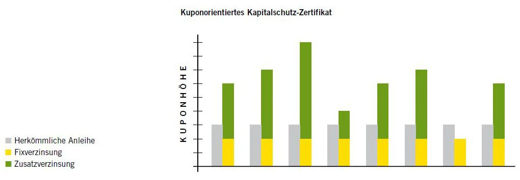 Zusätzlich zum Kapitalschutz und einer eventuellen festen Verzinsung sind kuponorientierte Kapitalschutz-Zertifikate mit einer oder mehreren Optionen ausgestattet. Diese bieten die Chance auf eine über dem Niveau des Anleihenmarktes liegende Verzinsung des eingesetzten Kapitals. Der erzielbare Mehrertrag wird dann gemeinsam mit der eventuellen festen Verzinsung ausbezahlt. Treten die Bedingungen für diese zusätzliche Chance nicht ein, erhält der Anleger am Laufzeitende die feste Verzinsung sowie den Kapitalerhalt.