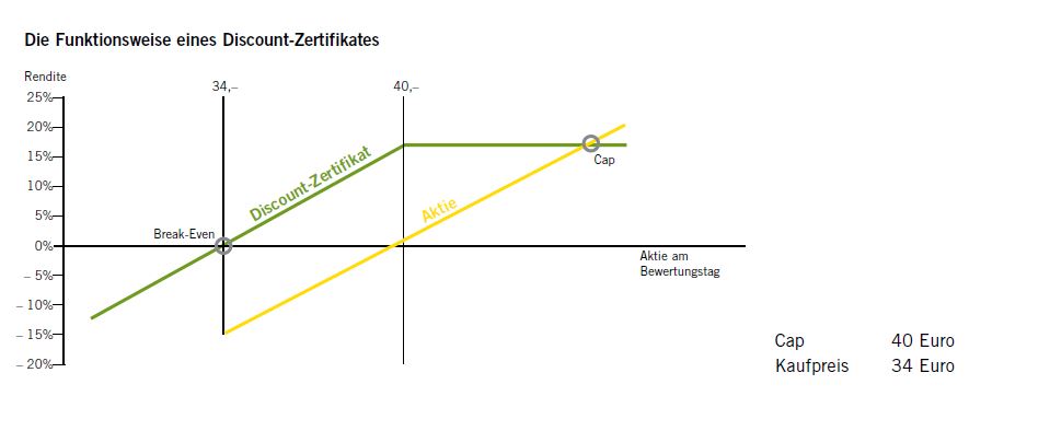 Dem Discount-Zertifikat liegt die Aktie XY zugrunde. Der Discount ergibt sich aus der prozentuellen Differenz zwischen dem Kurs des Zertifikates von 34 Euro und dem Kurs der zugrunde liegenden Aktie XY von 40 Euro zum Zeitpunkt des Zertifikatekaufs. Die Rückzahlung des Zertifikates erfolgt am Fälligkeitstag zum Schlusskurs der Aktie, maximal jedoch zu 40 Euro (Cap).