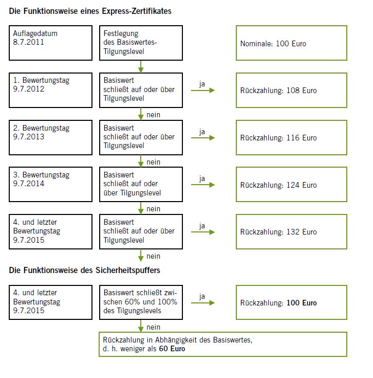 Ein Basiswert liegt zum Startzeitpunkt des Express-Zertifikates bei 3.000 Punkten. Das Tilgungslevel wird ebenfalls bei 3.000 Punkten festgelegt. Die Laufzeit beträgt vier Jahre. Einmal jährlich wird jeweils zum 9. 7. der Stand des Index geprüft. Liegt der Index bereits am ersten Stichtag auf oder über 3.000 Punkten, so erhält der Anleger 100 plus 8 Euro pro Zertifikat und es erfolgt automatisch die vorzeitige Rückzahlung. Wird das Zertifikat nicht vorzeitig zurückgezahlt, so wiederholt sich das Prozedere ein Jahr später. Nun besteht eine Rückzahlungschance von 100 plus 16 Euro. Sollte die Rückzahlung zu diesem Zeitpunkt immer noch nicht erfolgen, so gibt es zwei weitere Stichtage und die Rückzahlungschance erhöht sich auf 100 plus 24 Euro bzw. 100 plus 32 Euro pro Zertifikat. Erreicht der Basiswert auch am Ende der Laufzeit das Tilgungslevel nicht, so kommt es auf die Barriere an. Bis zu einem Indexwert von 60 Prozent des Startniveaus ist der Anleger vollständig gegen Kursrückgänge abgesichert und es erfolgt zum Laufzeitende die Rückzahlung zu 100 Euro je Zertifikat. Liegt der Basiswert dagegen unter 60 Prozent des Startniveaus, so erfolgt die Rückzahlung 1:1 in Abhängigkeit zur Entwicklung des Basiswertes und es kommt zu einem Kapitalverlust.