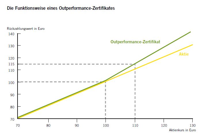 Mit Outperformance-Zertifikaten kann bereits bei moderat steigenden Märkten eine überdurchschnittliche Entwicklung erreicht werden. Bei Emission kaufen Anleger dieses Produkt in der Regel zu einem ähnlichen Preis wie dem Basiswert. Wird der zuvor festgelegte Basispreis überschritten, so können Anleger von den Kursgewinnen überproportional profitieren.