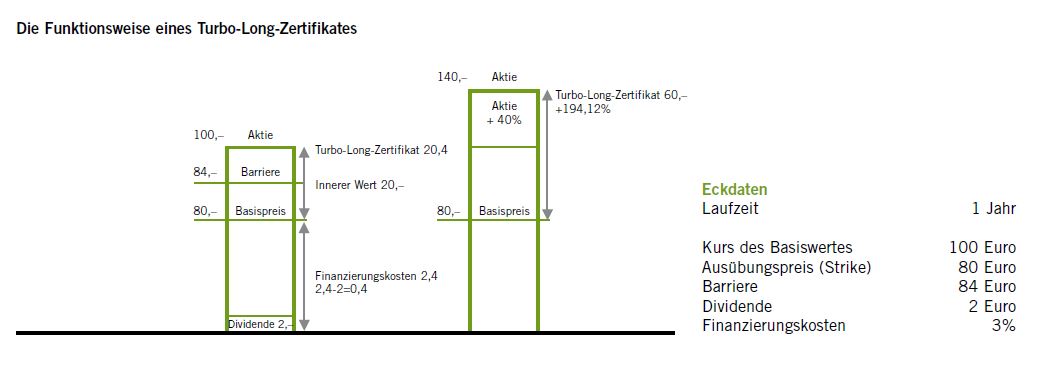Bei einem Turbo-Long-Zertifikat (Knock-Out Call) mit einjähriger Laufzeit, bei dem sich der Kurs des Basiswertes bei 100 Euro befindet und der Basispreis (Strike) bei 80 Euro bzw. die Barriere bei 84 Euro festgesetzt wurde, liegt der innere Wert bei 20 Euro. Bei einer Annahme von 2 Euro Dividende und 3 Prozent Finanzierungskosten würde das Turbo-Long-Zertifikat aktuell ca. 20,4 Euro kosten (20 Euro innerer Wert plus 2,4 Euro Finanzierungskosten minus 2 Euro Dividende). Ist der Basiswert bis Endfälligkeit auf 140 Euro gestiegen, ergibt dies einen inneren Wert von 60 Euro sowie eine positive Rendite von 194,12 Prozent.