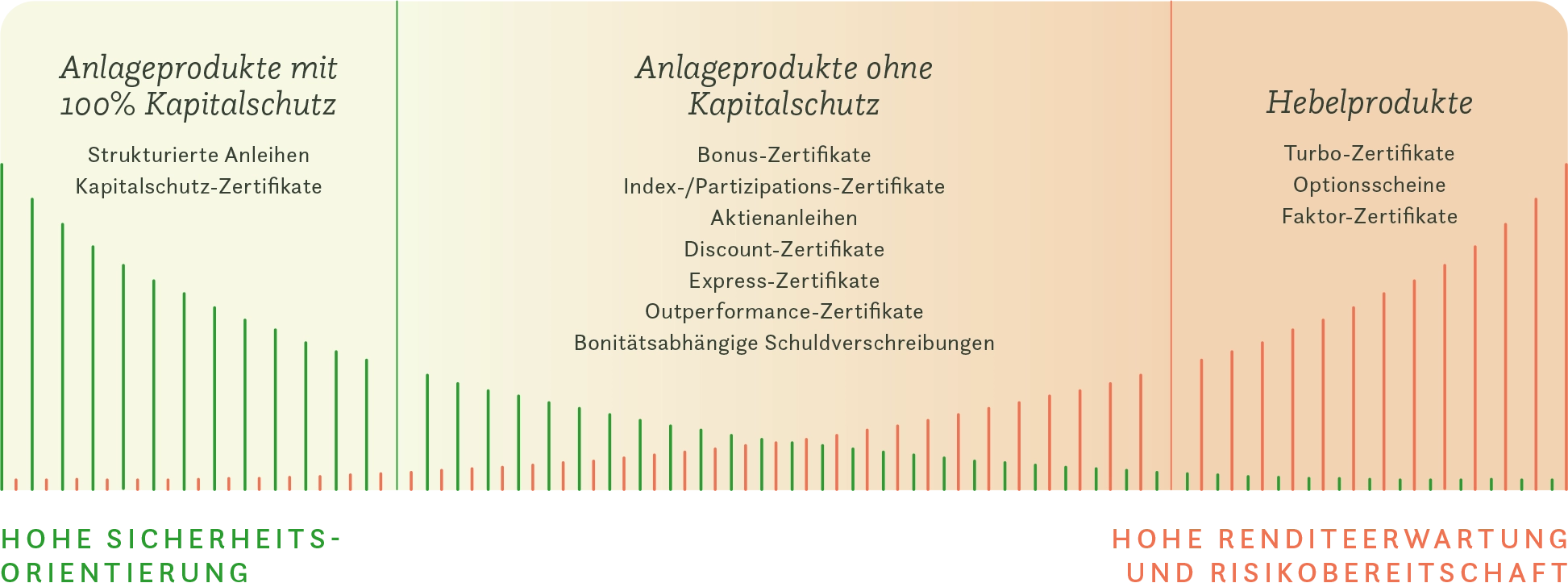 Anlageprodukte sind für Investmentstrategien mit tendenziell mittel- bis langfristiger Orientierung geeignet. Sie haben ein ähnliches oder sogar weniger Risiko als der zugrunde liegende Basiswert. Zu Anlageprodukten ohne Kapitalschutz zählen Bonus-Zertifikate, Index-/Partizipations-Zertifikate, Aktienanleihen, Discount-Zertifikate, Express-Zertifikate, Outperformance-Zertifikate und bonitätsabhängige Schuldverschreibungen.